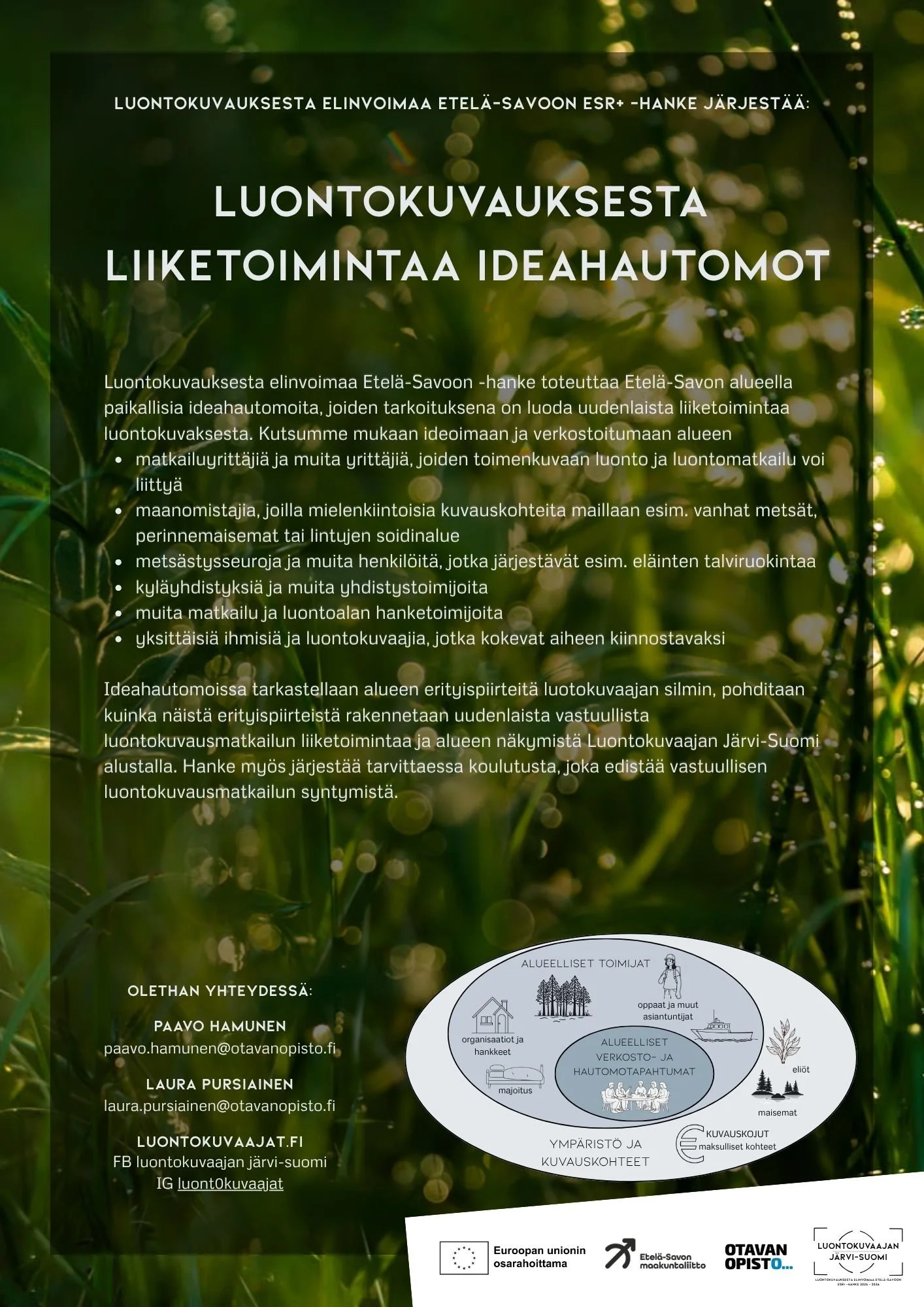 Luontokuvauksesta elinvoimaa Etelä-Savoon -hanke toteuttaa Etelä-Savon alueella paikallisia ideahautomoita, joiden tarkoituksena on luoda uudenlaista liiketoimintaa luontokuvaksesta. Kutsumme mukaan ideoimaan ja verkostoitumaan