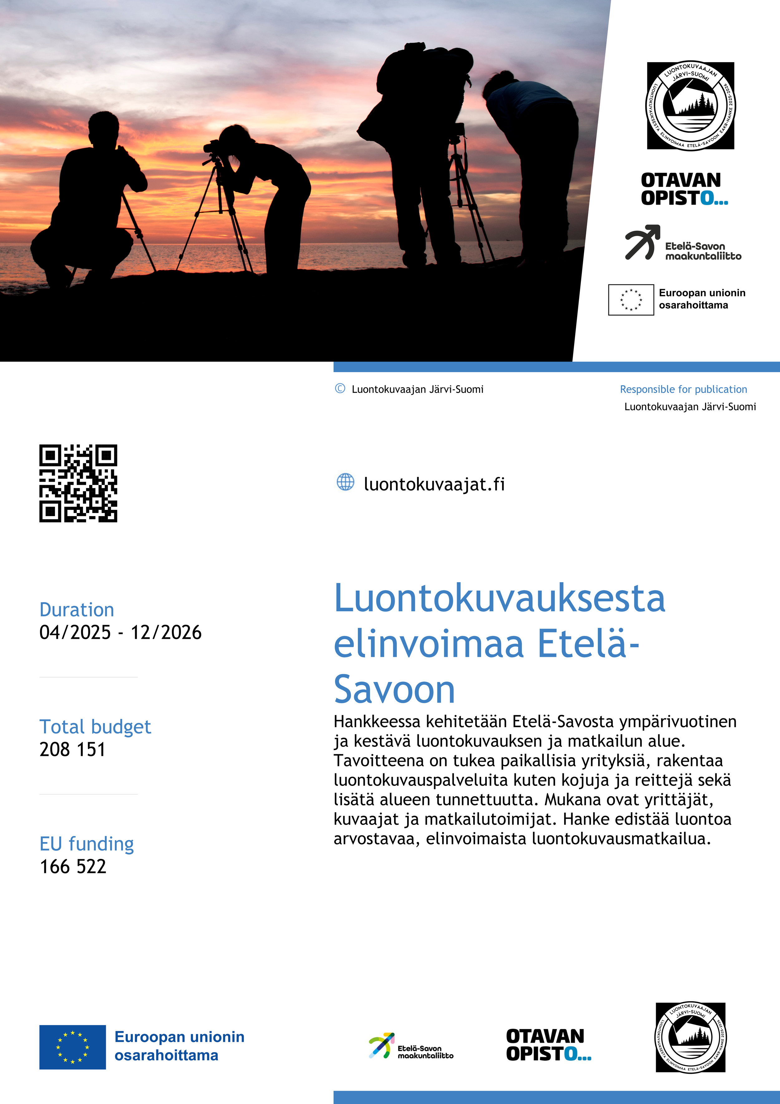 Tässä hankkeessa kehitetään Saimaan alueesta huippuluokan luontokuvauksen kohde ympäri vuoden – ekologisesti ja paikallisesti.